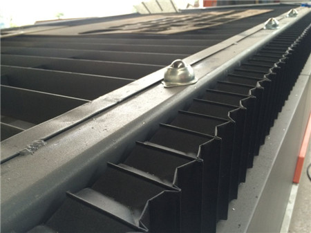 該型臺式數(shù)控切割機(jī)割臺部分采用龍門式數(shù)控切割機(jī)使用的扁鐵型割臺,其結(jié)構(gòu)是用一定寬度80mm和厚度5mm的扁鐵(一般用鐵板剪切成v型結(jié)構(gòu)),相互平行排列組成。間距大小可根據(jù)常用下料板材厚度及零件大小來確定,一般為100-150mm。扁鐵在使用過程中是易損件,為便于更換,采用插入式結(jié)構(gòu)。